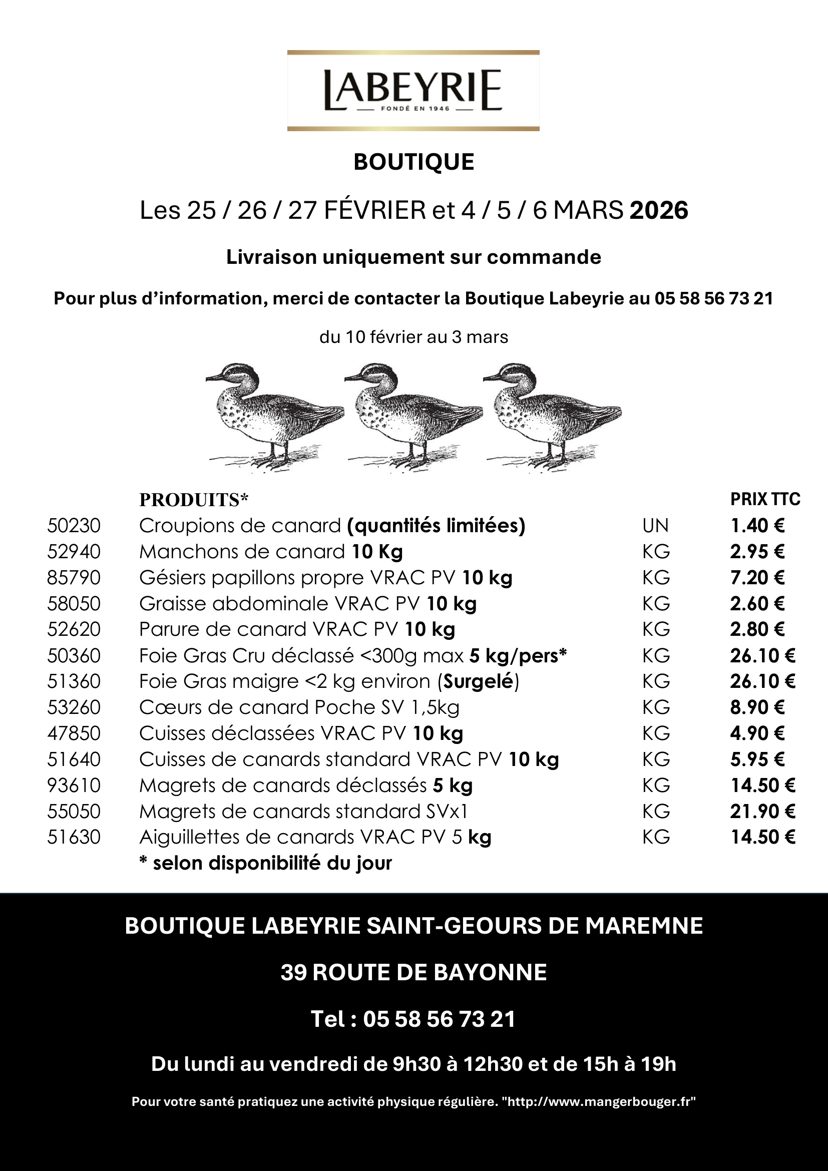 Les produits sont Ă commander Ă la Boutique avant le 3 mars : 05 58 56 73 21