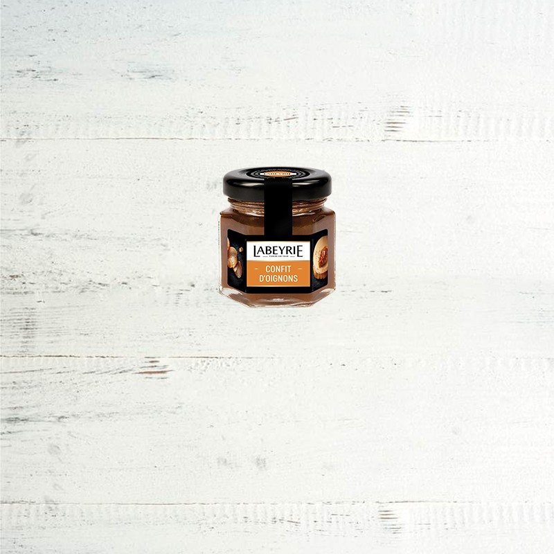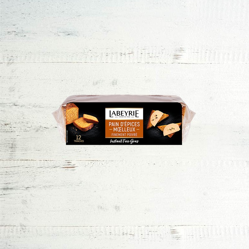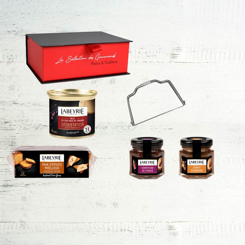 Ingrédients : Foie Gras de canard (origine France), eau, sel, Armagnac (0,8%), épices, sucre, antioxydant : E301, conservateur : E250 Energie 2200 kJ - 534 kcal, Matières grasses 55 g dont acides gras saturés 23 g, Glucides 2.4 g dont sucres 1.9 g, Protéines 7.3 g, Sel 1.2g*Pain d'épices spécial Foie Gras – Ingrédients : Farine de seigle (contient gluten), sucre, miel 15%, eau, jaunes d'œufs de poules élevées au sol, épices 1,1% (gingembre, cannelle, muscade, poivre 0,15%), poudre à lever : carbonates de sodium. Energie 1474 kJ - 348 kcal, Matières grasses 2.1g dont acides gras saturés 0g, Glucides 76g dont sucres 46g, Protéines 4.9g, Sel 0g. *Confiture de Figues – Ingrédients : figues violette (50%), sucre de canne, jus de citron concentré, gélifiant : pectine de fruits. Préparée avec 50 g de fruits pour 100g. Teneur totale en sucres : 55 g pour 100g. Energie 940 kJ - 221 kcal, Matières grasses 0g, Glucides 54g dont sucres 53g, Protéines 0.7g, Sel 0g. *Confit d'Oignons – Ingrédients : oignons (52%), sucre de canne, vin blanc sec, vinaigre, sel, poivre. Energie 947 kJ - 223 kcal, Matières grasses 0.2g dont acides gras saturés 0g, Glucides 53g dont sucres 51g, Protéines 1.1g, Sel 2.1g.