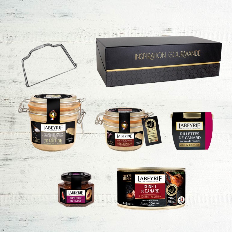 Foie Gras de Canard Entier « Tradition » bocal 180g*Foie Gras de Canard Entier du Sud-Ouest Tradition - Ingrédients : Foie Gras Entier du Sud-Ouest sel, poivre (0.1%) Fleur de sel (0.2 %), sucre–Energie 2200 kJ - 534 kcal, Matières grasses 55 g dont acides gras saturés 23 g, Glucides 2.4 g dont sucres 1.9 g, Protéines 7.3 g, Sel 1.2g. Foie Gras de Canard Entier du Sud-Ouest « Dégustation » - bocal 125g ingrédients *Foie Gras de Canard Entier du Sud-Ouest – Ingrédients : Foie Gras de canard du Sud-Ouest, sel, Armagnac (0.6%), épices, sucre, Energie 2200 kJ - 534 kcal, Matières grasses 55 g dont acides gras saturés 23 g, Glucides 2.4 g dont sucres 1.9 g, Protéines 7.3 g, Sel 1.2 g. Ingrédients :*Rillettes de Canard au Foie Gras – Ingrédients : viande de canard (74%) (origine :France), foie gras de canard (20%), foie maigre de canard (origine : France, eau, sel, Armagnac, sucre, antioxydant : E301, conservateur : E250. Energie 1666 kJ - 404 kcal, Matières grasses 40g dont acides gras saturés 15g, Glucides 0g dont sucres 0g, Protéines 10g, Sel 12g. *Confit de Canard 4/6 cuisses – Ingrédients : cuisses de canard (origine France), graisse de canard. Energie 1091 kJ - 262 kcal, Matières grasses 18g dont acides gras saturés 6.3g, Glucides 0g dont sucres 0g, Protéines 25g, Sel 2g. *Confiture de Figues – Ingrédients : figues violette (50%), sucre de canne, jus de citron concentré, gélifiant : pectine de fruits. Préparée avec 50 g de fruits pour 100g. Teneur totale en sucres : 55 g pour 100g. Energie 940 kJ - 221 kcal, Matières grasses 0g, Glucides 54g dont sucres 53g, Protéines 0.7g, Sel 0g.